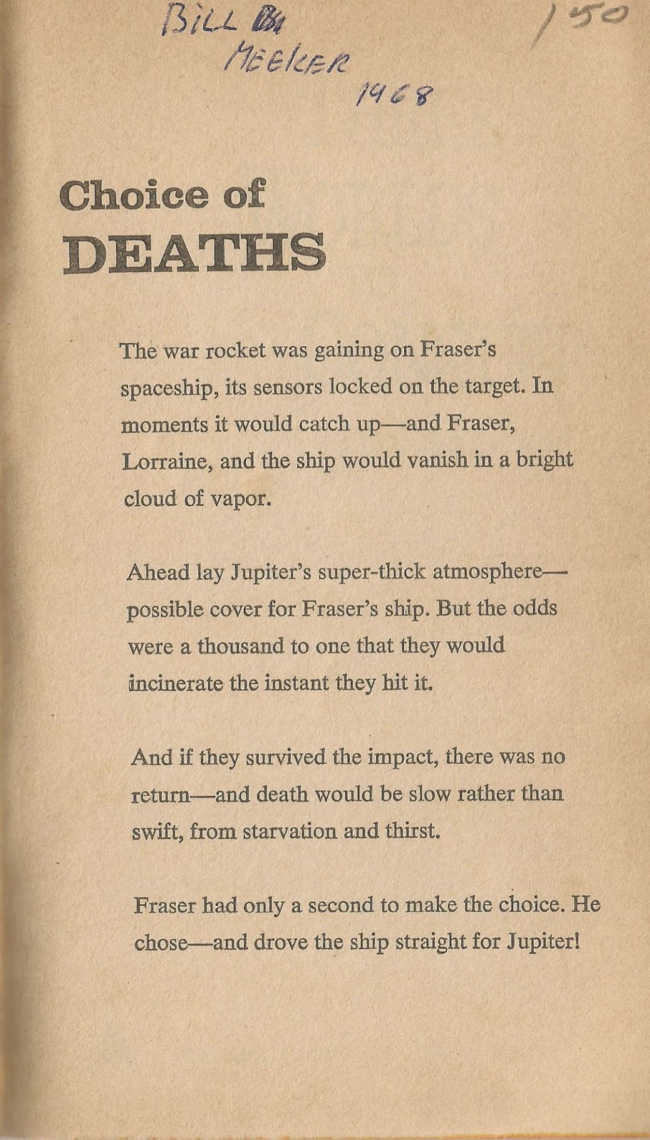"For many millions of years they have been educated with the dream of universal conquest. They have been so thoroughly propagandized with the philosophy that the state, the civilization, the race is everything...that the individual does not count at all...that there is not a single one of them who would not die to achieve that dream. They glory in dying, glory in any sort of sacrifice that advances them even the slightest step toward their eventual goal."There are a lot of SF stories in which the human race is shown to be inferior to aliens, but in Cosmic Engineers Simak celebrates human heroism and ability and suggests that our people are equal or superior to any people in all the universes! The C.E.s dismiss the representatives of all those other intelligent species, because only the thought processes of the Earth people are on the C.E. wavelength--only the human race is in a position to foil the Hellhounds and save the universe!