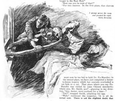 "Do it!" he snapped. "There are no speed limits for me."Petrie is also more interesting. In the first Fu-Manchu book Karamaneh was inexplicably in love with the English physician, but in this volume it is Petrie who is lovesick for the Eastern girl, and he goes on and on about her musical voice and dark eyes and so on. For her part, Karamaneh has apparently totally forgotten about Smith and Petrie, who in The Insidious Dr. Fu-Manchu liberated her and her brother from the clutches of Fu-Manchu. (We eventually learn that Fu-Manchu has erased her memory.) Smith, like any good friend, is there to provide relationship advice to his heartbroken buddy: