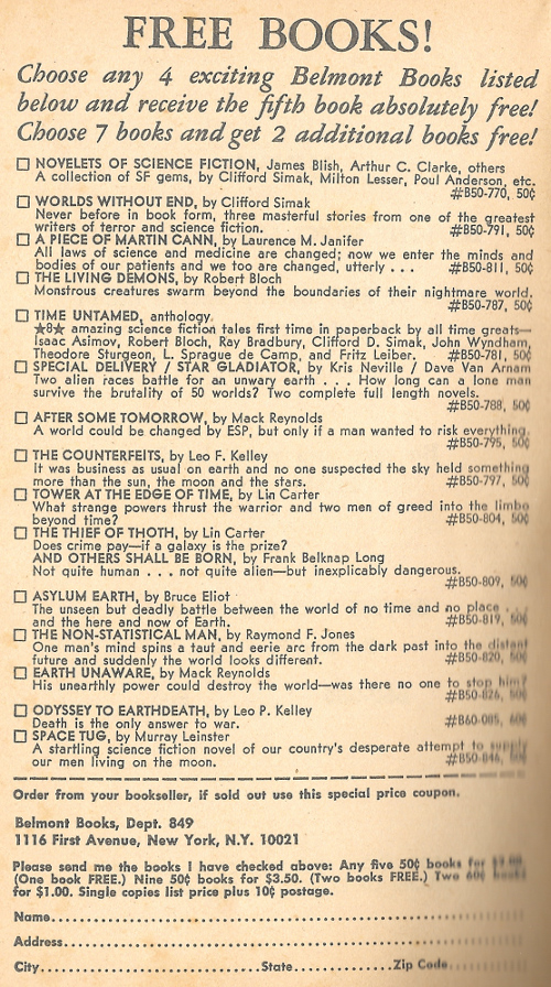 This third volume of Offutt and Lyon's trilogy is an elaborate production, with 24 pages of glossary and gazetteer in the back, and a two-page map of Tiana's world in the front. (A look at the map and gazetteer reveals that some of the geographical names are homages to Edgar Rice Burroughs.) Preceding the main text, there's even a (terrible) poem about Tiana, Pyre and Ekron! War of the Wizards is a labor of love, and Offutt and Lyon put real effort into it, which you can see in the text, and which is a welcome contrast to things like Ken Bulmer's Kandar, which feel like they were just thrown together haphazardly to meet a deadline.