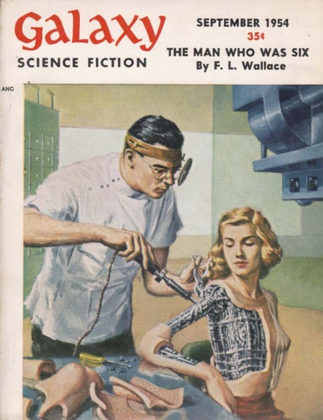 This story is OK. I like that the narrator is the villain and his villainy is only hinted at for much of the story, and I like the brain-transplanting German mad scientist angle, but Bloch needlessly complicates things with a lot of talk of how the robot bodies need to go offline periodically and so during those periods Stern has to blackmail criminals who look like the stars into impersonating them, blah blah blah. (You'll remember that I also thought Bloch needlessly complicated the process of giving people eternal life in his 1951 story "The Dead Don't Die.") Bloch should have ditched the impersonation angle and focused on the Frankenstein stuff--ofttimes less is more, Robert, less is more.