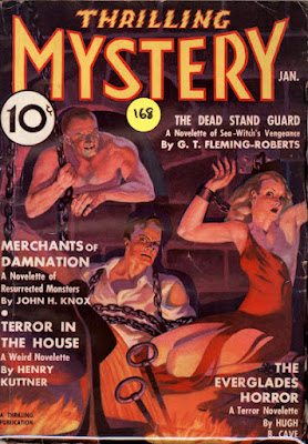I have to return my interlibrary loan copy of the Henry Kuttner collection Terror in the House soon, so let's read four stories penned by Kuttner that have awesome titles and appeared in Thrilling Mystery in 1937. Is there any chance they can live up to those titles? The fact that none of these stories were reprinted until 2010 may provide a clue, but we're going to read them anyway.