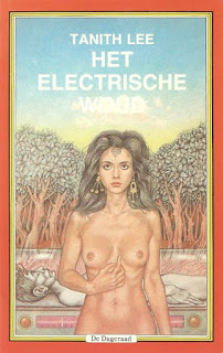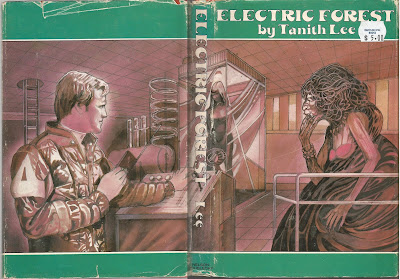 Another of my South Carolina purchases, the hardcover first edition of Tanith Lee's 1979 novel Electric Forest, published by Nelson Doubleday.  It looks like a previous owner inscribed his or her name on the first page, but this evidence of ownership was then removed by the expedient of cutting off the corner of the page.  Curious.