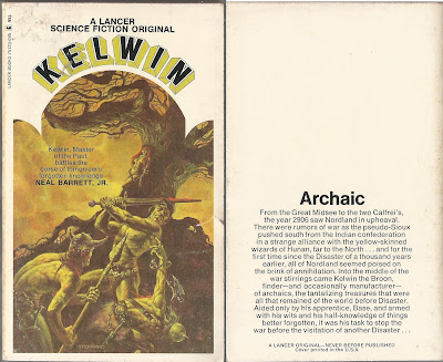 I bought Neal Barrett Jr.'s 1970 novel Kelwin because I found the oddly-colored but sanguine and sexalicious Steranko cover, with its muscular hero dressed in skull-adorned underpants and its curvaceous heroine clad in chains, attractive. Such a cover promises excitement!